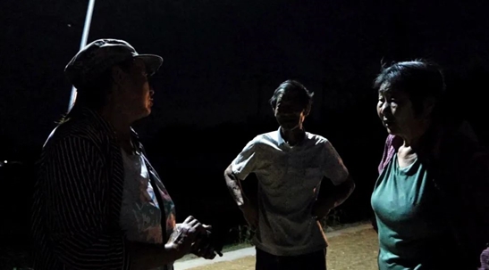 天氣預報報道兩天后還會降雨,已是深夜的村口依然人影攢動,村民們夜不能寐,排隊等待搶收。人群里,母親張振華正與等待搶收的村民們合計收割的順序。